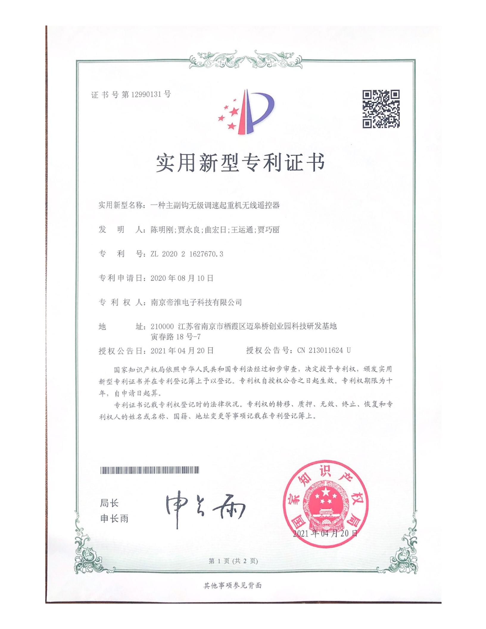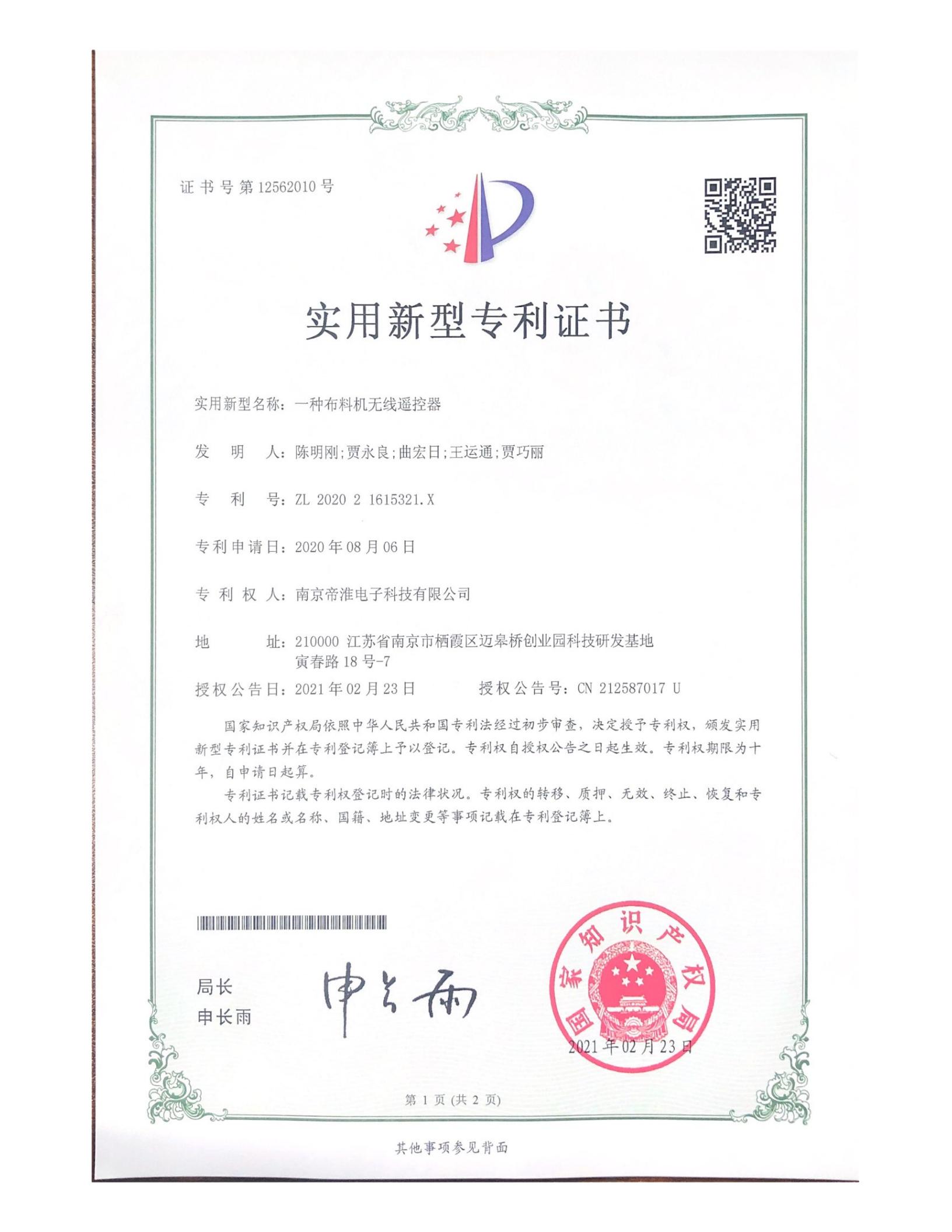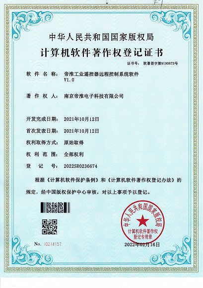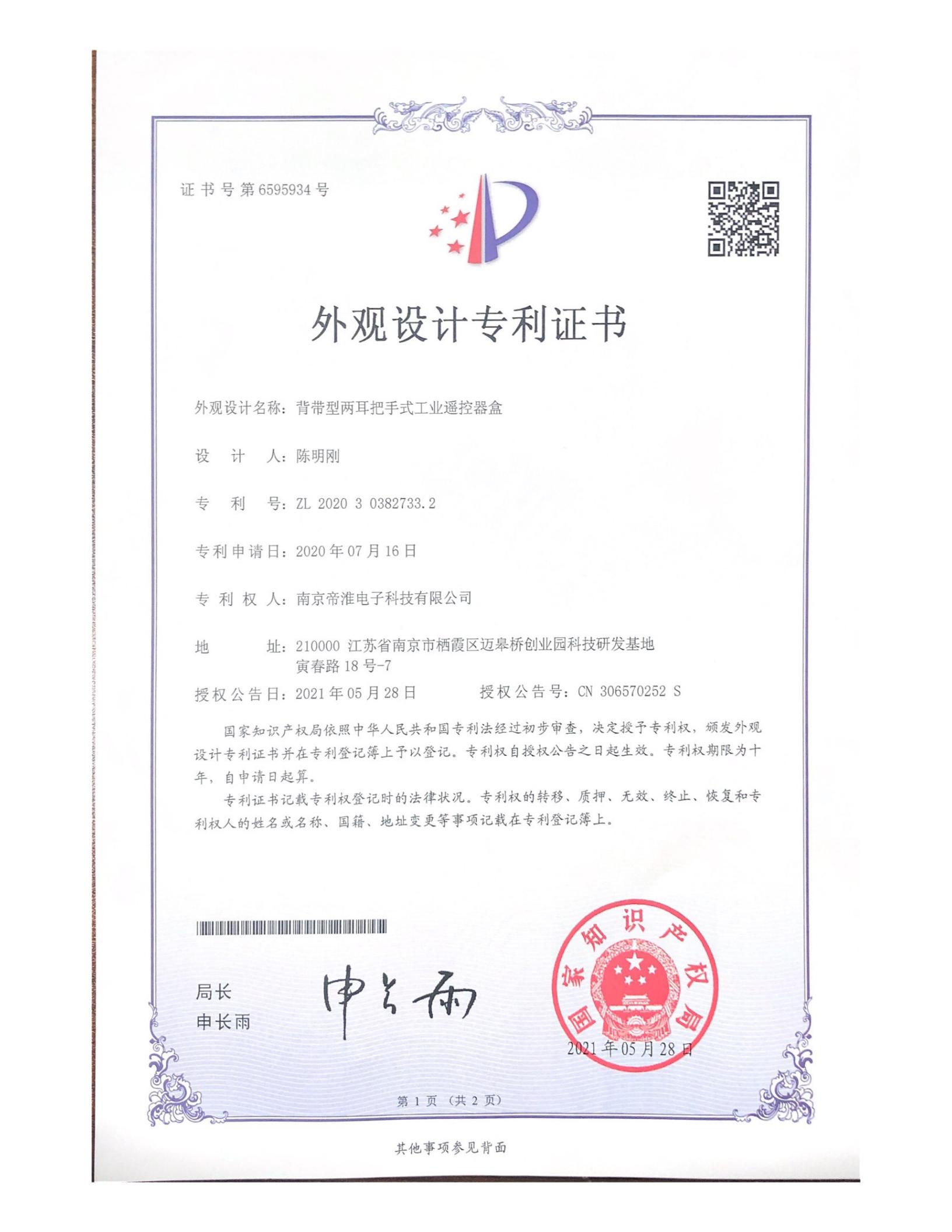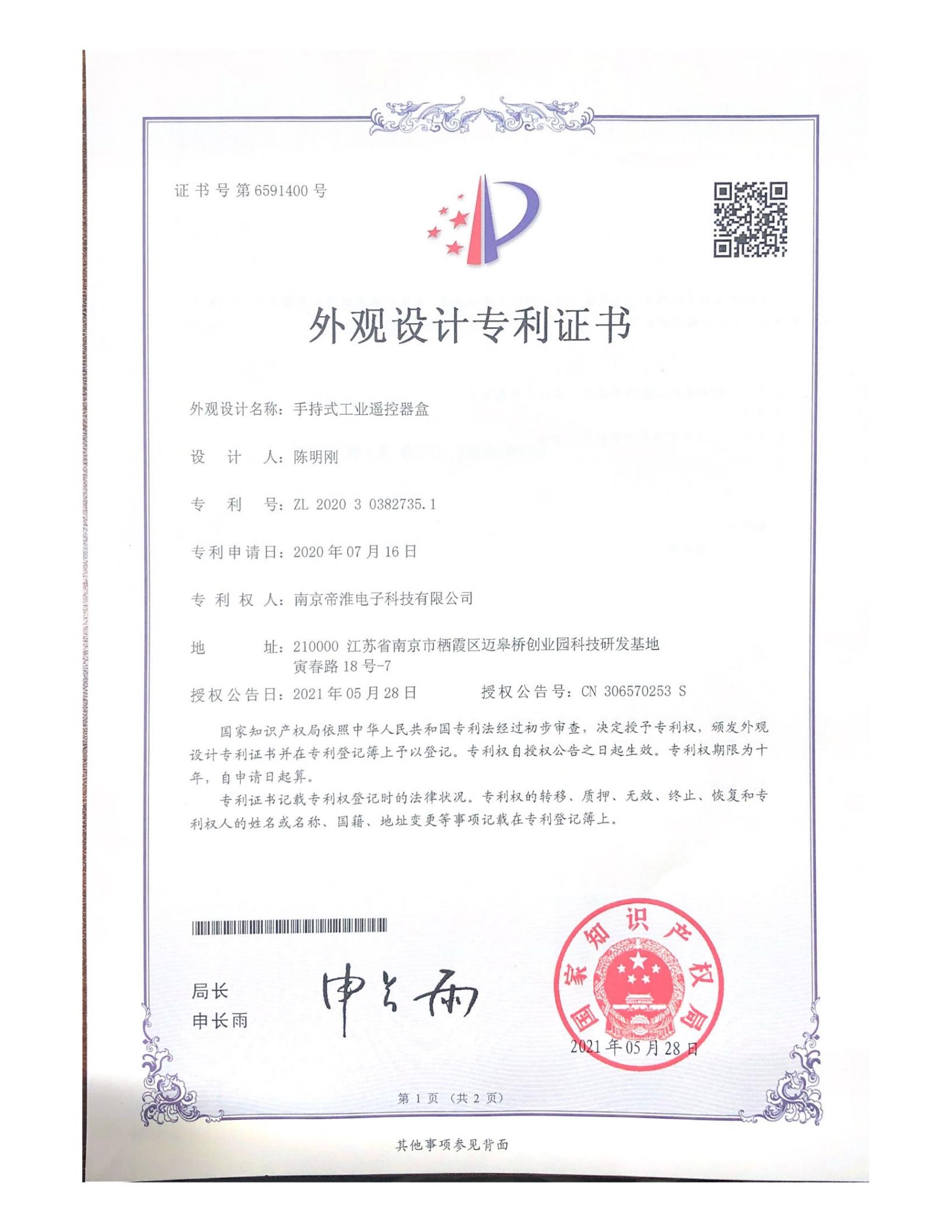 南京帝淮电子科技有限公司,国内工业遥控器行业领军企业,自主研发、定制、非标设计各类工业级无线??仄鳌⒐ひ导队邢呖刂破鳌⒅悄芑灾魉惴呒谋镜乜刂破鞯认盗胁?。已经申请及正在申请的技术专利、外观专利有近三十项左右,并通过了CE欧盟认证、国家级试验检验报告、EMC电磁兼容认证等。